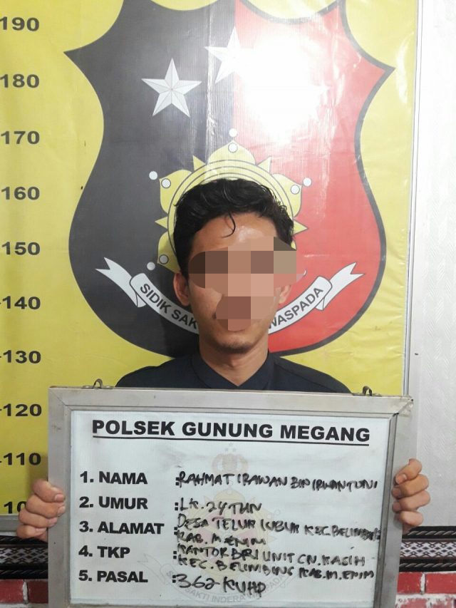 Kapolsek Gunung Megang AKP Feryanto, S.H., membenarkan penangkapan seorang diduga pelaku pencurian uang setoran di meja teler atau kasir Bank BRI Unit cinta Kasih Belimbing sebesar Rp. 50 Juta beberapa waktu lalu.
