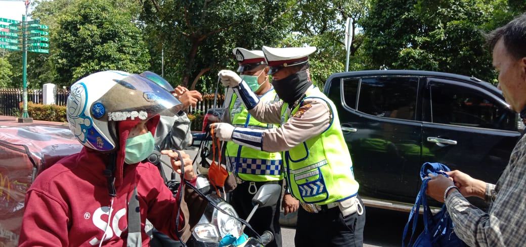 Dari pantauan dilokasi, tampak masyarakat pengguna jalan sangat antusias menerima bantuan masker gratis dari LSM GRANSI yang dibantu oleh petugas Satlantas Polrestabes Palembang.**@(Ariel)