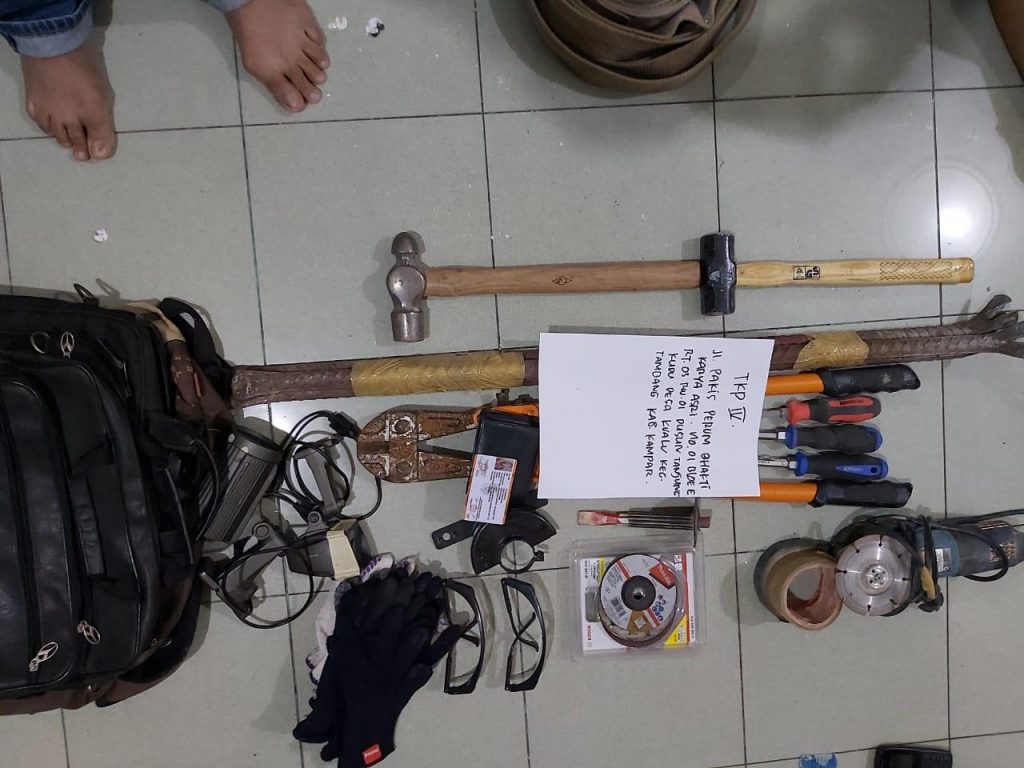 Setelah dirasa aman, mereka menuju tempat penyimpanan brankas utk ambil isinya secara paksa menggunakan alat linggis dan mesin gerindra yang dibawa AB (DPO), bahkan sampai membobol tembok untuk memperlancar aksinya,” Papar Sunarto.