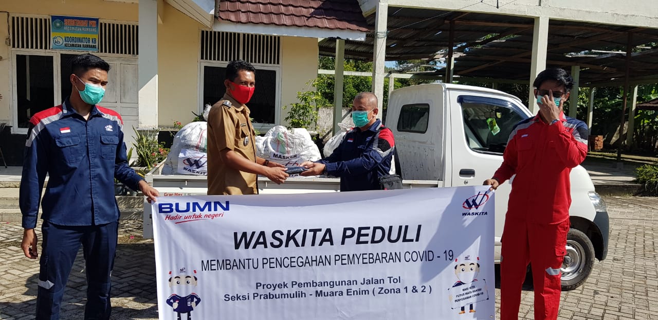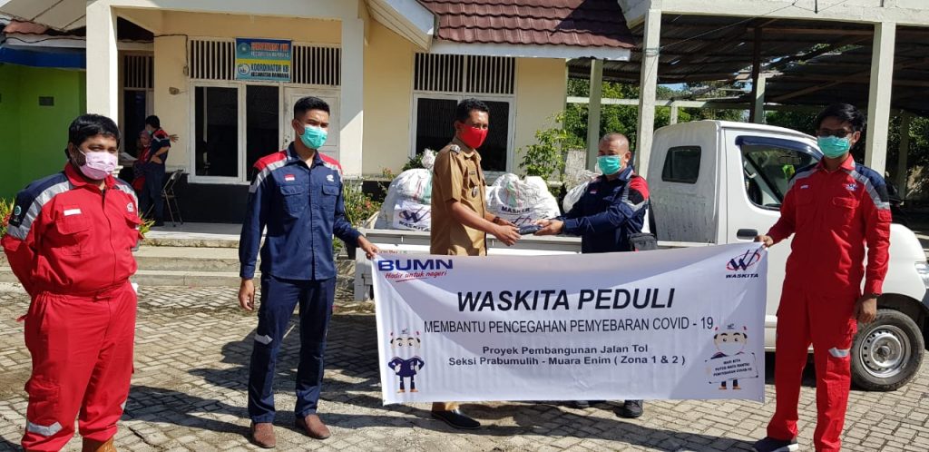 Muara Enim, Warta Reformasi – Project Manager PT. Waskita Karya (Persero) Tbk, Dhetik Ariyanto, selaku pelaksana proyek pembangunan Jalan Tol Prabumulih – Muara Enim (zona 1 dan 2) melaksanakan kegiatan “WASKITA PEDULI” turut serta membantu pencegahan terhadap virus corona dan Peduli dampak Covid -19,  memberikan bantuan berupa Beras sebanyak 9 ton, masker kain 8.000 pcs dan vitamin C 400 botol.