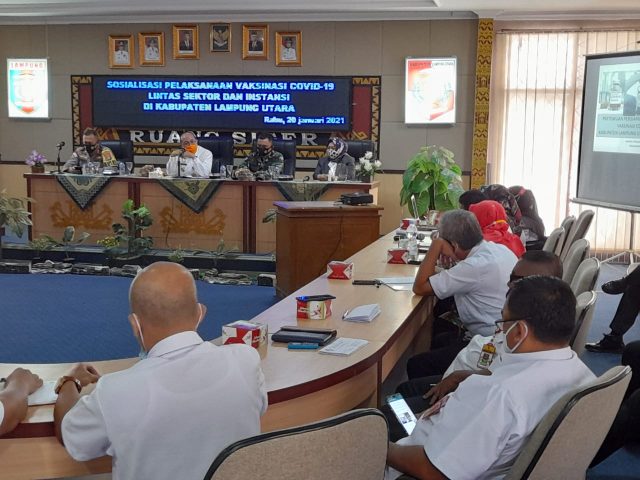 LAMPUNG UTARA, Warta Reformasi – Pemerintah Kabupaten (Pemkab) Lampung Utara (Lampura) menggelar sosialisasi pelaksanaan vaksinasi Covid-19 lintas sektor dan instansi di ruang Siger Pemkab setempat, Rabu (20/1).