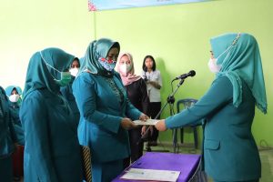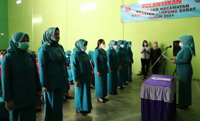 Lampung Barat, Warta Reformasi – Bertepatan momentum peringatan Hari Kesatuan Gerak Pemberdayaan dan Kesejahteraan Keluarga (HKG PKK) Ke-49 tahun 2021, Ketua TP-PKK Kabupaten Lampung Barat (Lambar), Partinia Parosil melantik pengurus PKK kecamatan, berlangsung di Pekon (Desa) Hanakau Kecamatan Sukau, Rabu (10/3/2021).