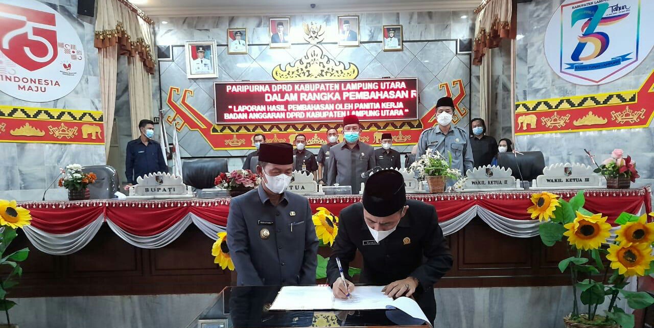 Lampung Utara, Warta Reformasi – Bupati Lampung Utara (Lampura), Hi.  Budi Utomo, S.E., M.M., bersama Dewan Perwakilan Rakyat Daerah (DPRD) menggelar rapat paripurna pertanggungjawaban pelaksanaan anggaran pendapatan dan belanja daerah (APBD) tahun anggaran 2020, berlangsung di gedung DPRD setempat,  Senin (21/6/2021).