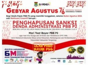 Kabupaten Tangerang, Warta Reformasi – Badan Pendapatan Daerah (Bapenda) Kabupaten Tangerang kembali menggelar kebijakan penghapusan sanksi denda administrasi Pajak Bumi dan Bangunan Pedesaan dan Perkotaan (PBB-P2) untuk seluruh masa pajak atau tahun dalam rangka program Semarak Gebyar Agustus.