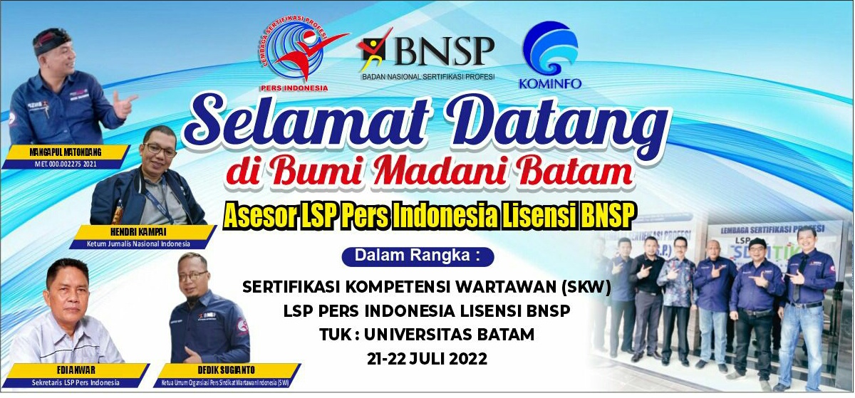 Jakarta, Wartareformasi.com – Setelah sukses di Kota Surabaya, Kabupaten Tulungagung, dan Kota Pekanbaru, Lembaga Sertifikasi Profesi Pers Indonesia kini merambah Kota Batam, Provinsi Kepulauan Riau. Sertifikasi Kompetensi Wartawan ( SKW ) di Kota Batam akan berlangsung selama dua hari Tempat Uji Kompetensi (TUK) Universitas Batam pada 21 dan 22 Juli 2022.