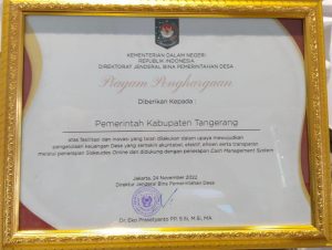 Pada kesempatan terserbut, Sekda mengungkapkan bahwa Penghargan diberikan sebagai bentuk apresiasi karena Pemerintah Kabupaten Tangerang dinilai berhasil atas implementasi inovasi yang dilakukan dalam upaya mewujudkan pengelolan keuangan desa yang semakin akuntabel, efektif, efisien serta transparan melalui penerapan sistem Siskudes Online dan didukung dengan penerapan Cash Management System.