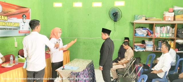 “Pelantikan sekaligus pengambilan sumpah jabatan juga memperkuat tata usaha pemerintahan Kampung, ini digelar di Aula Kampung Tanjung Raja Sakti, Rabu (9/7/2025).