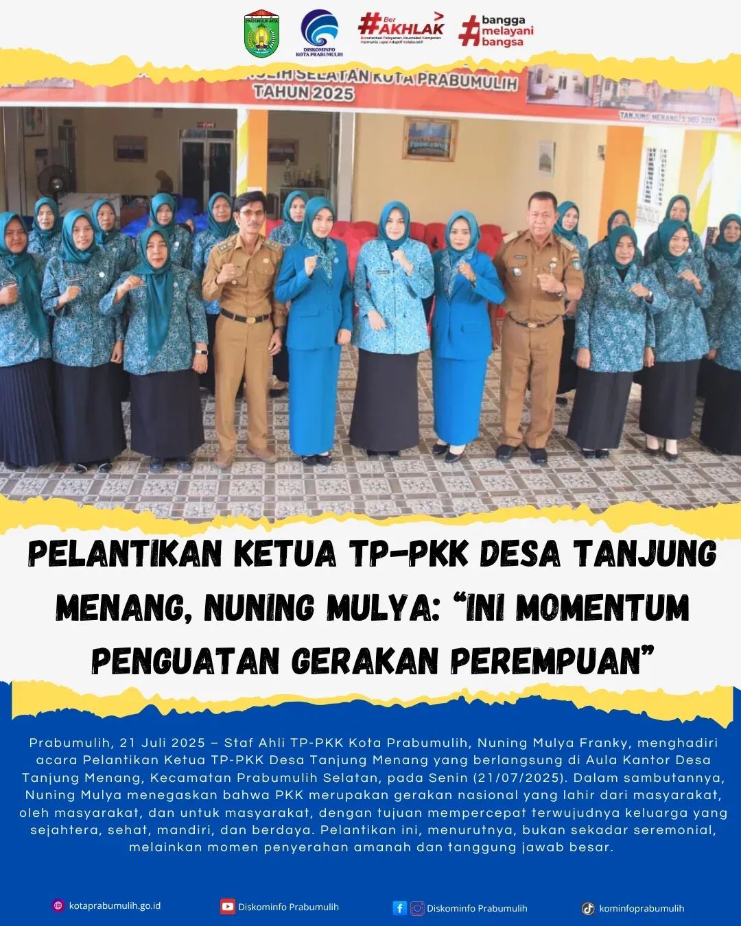Ia mengajak seluruh pemangku kepentingan – camat, kepala desa, lurah, serta tokoh masyarakat – untuk mendukung penuh program kerja TP-PKK, khususnya di Desa Tanjung Menang.”Pelantikan ini hendaknya menjadi titik awal semangat baru untuk membangun PKK Desa Tanjung Menang yang solid, aktif, dan berdampak nyata bagi masyarakat,” tutupnya.**@Diskominfo/Sitoh
