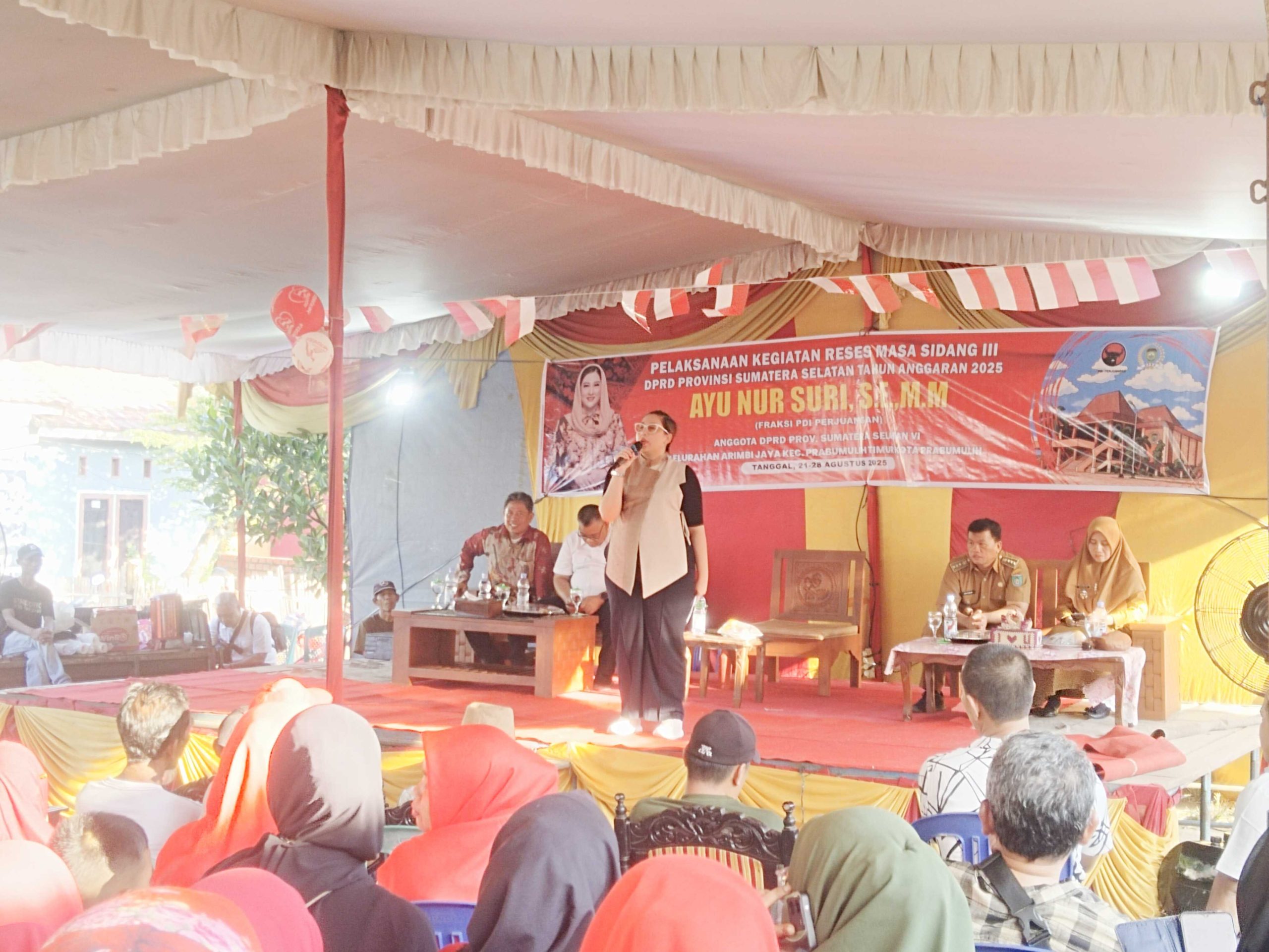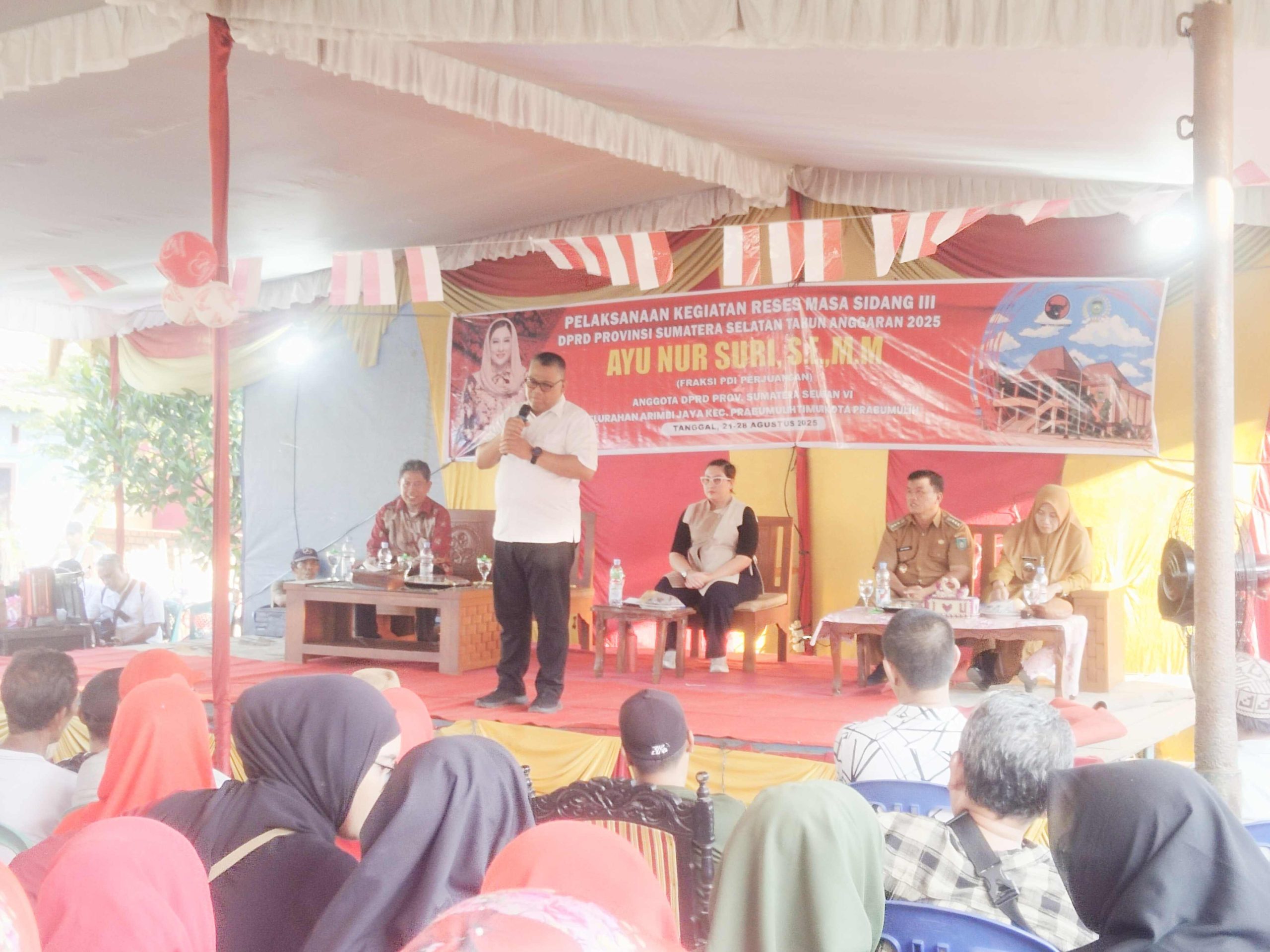 Kota Prabumulih, Wartareformasi.com – Anggota DPRD Provinsi Sumatra Selatan, Ayu Nur Suri SE MM didampingi Anggota Komisi II DPR RI, Dr. Giri Ramanda N Kiemas SE MM melakukan reses masa sidang Ke – III tahun 2025 di Kelurahan Arimbi Jaya Kecamatan Prabumulih Timur, Bertempat di lapangan Perumahan Palem Prabu Jaya, Senin (25/8/2025).