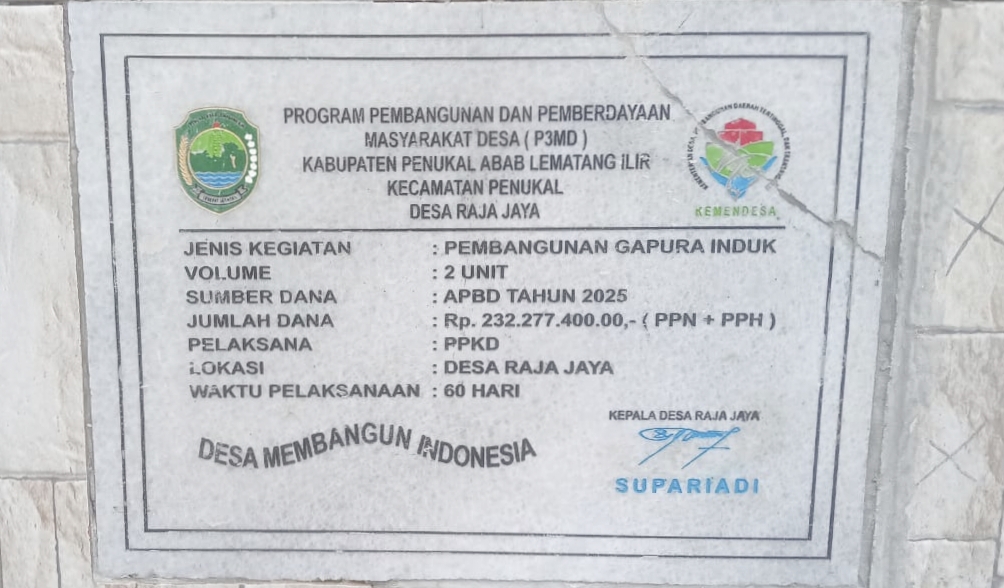 Kabupaten PALI, Wartareformasi.com – Pemerintah Desa (Pemdes) Raja Jaya Kecamatan Penukal Kabupaten Penukal Abab Lematang Ilir (PALI) merealisasikan penggunaan Alokasi Dana Desa (ADD) APBD tahun anggaran 2025 untuk pembangunan Gapura Desa.